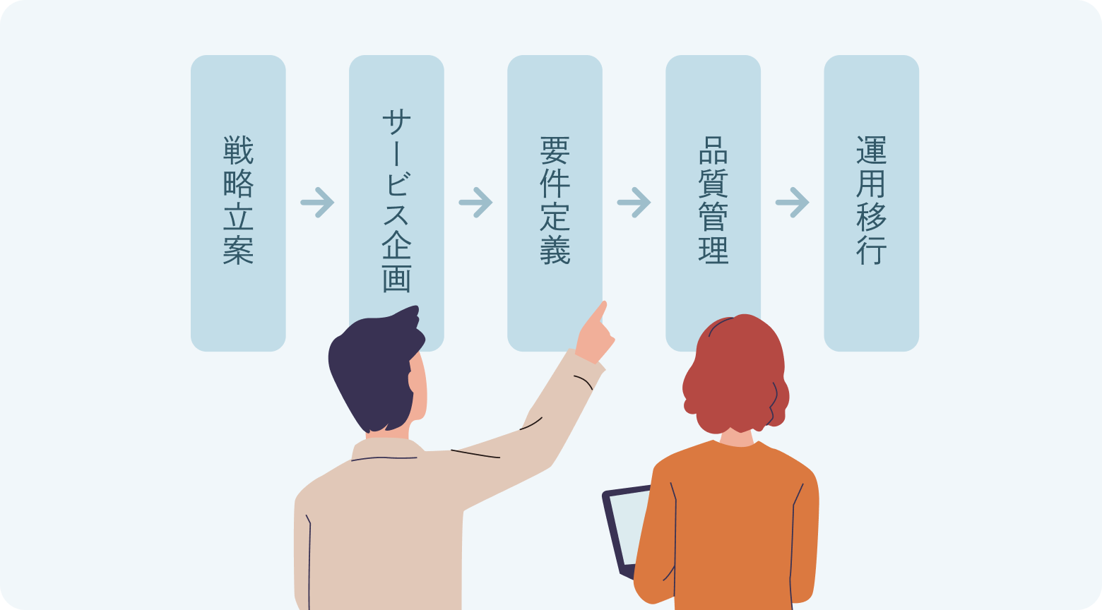 戦略構想段階からシステム開発プロジェクトの一員として参加し、戦略立案、サービス企画、要件定義、品質管理、運用移行、といった各種タスクをビジネスの立場に立って推進します。